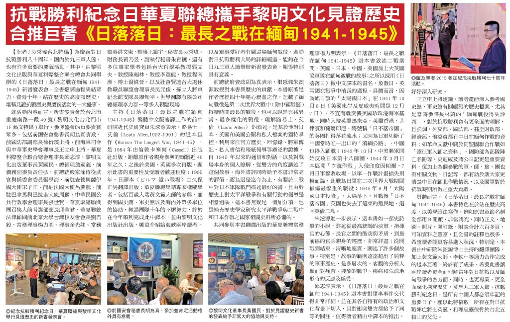 為慶祝對日抗戰勝利八十周年,國內於九三軍人節,也有許多重要的慶祝活動,其中,由黎明文化出版與華夏科際整合聯合總會共同舉辦的《日落落日:最長之戰在緬甸1941-1945》新書發表會,全書翻譯過程集結眾力、費時十年,站在歷史的高度談歷史,堪稱見證抗戰歷史與慶祝活動的一大盛事。