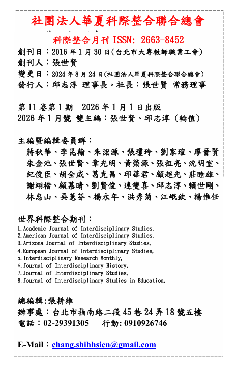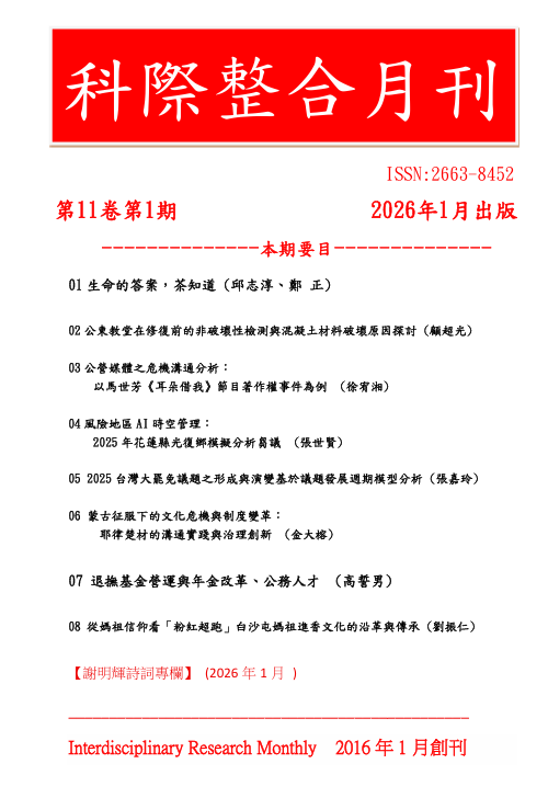 【科際整合月刊】第11卷第1期作者: SIDA / 2026 年 1 月 1 日 【科際整合月刊】第11卷第1期01生命的答案,茶知道 (邱志淳、鄭正)02公東教堂(顧超光)03公營媒體之危機溝通分析(徐宥湘)04風險地區AI時空管理(張世賢)05.2025台灣大罷免議題之形成與演變基於議題發展週期模型分析(張嘉玲)06蒙古征服下的文化危機與制度變革(金大榕12.24)07退撫基金營運與年金改革、公務人才 (高誓男)08從媽祖信仰看「粉紅超跑」白沙屯媽祖進香文化的沿革與傳承 (劉振仁)謝明輝詩詞專欄(115年1月) 01生命的答案,茶知道 (邱志淳、鄭正)下載 02公東教堂(顧超光)下載 03公營媒體之危機溝通分析(徐宥湘)下載 04風險地區AI時空管理(張世賢)下載 05.2025台灣大罷免議題之形成與演變基於議題發展週期模型分析(張嘉玲)下載 06蒙古征服下的文化危機與制度變革(金大榕12.24)下載 07退撫基金營運與年金改革、公務人才 (高誓男)下載 08從媽祖信仰看「粉紅超跑」白沙屯媽祖進香文化的沿革與傳承 (劉振仁)下載 謝明輝詩詞專欄(115年1月)下載